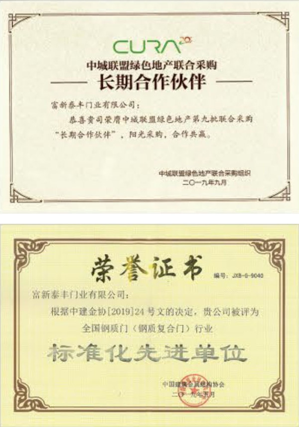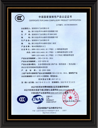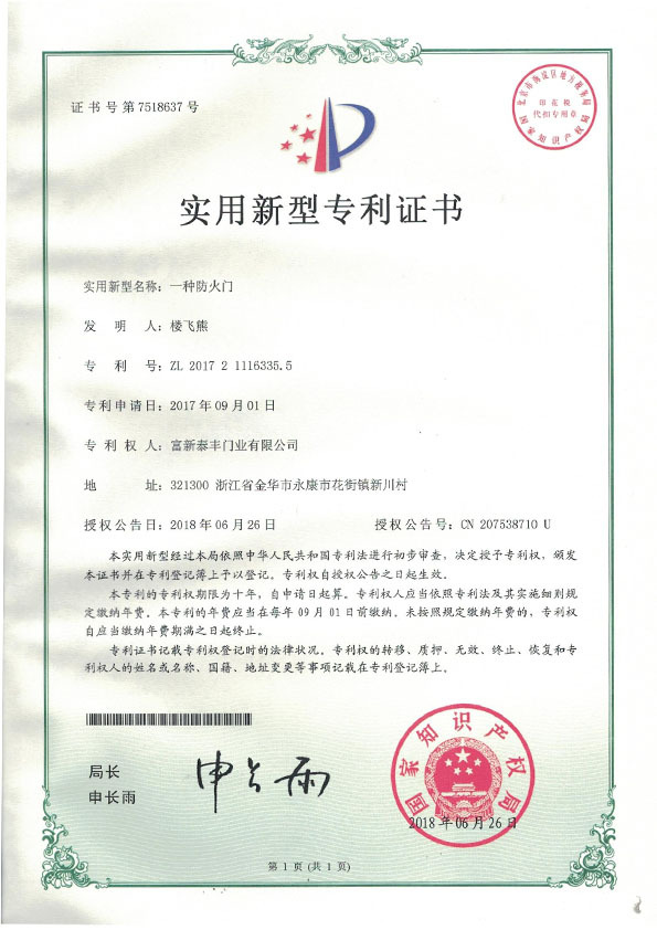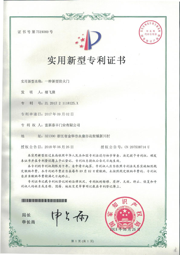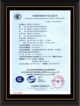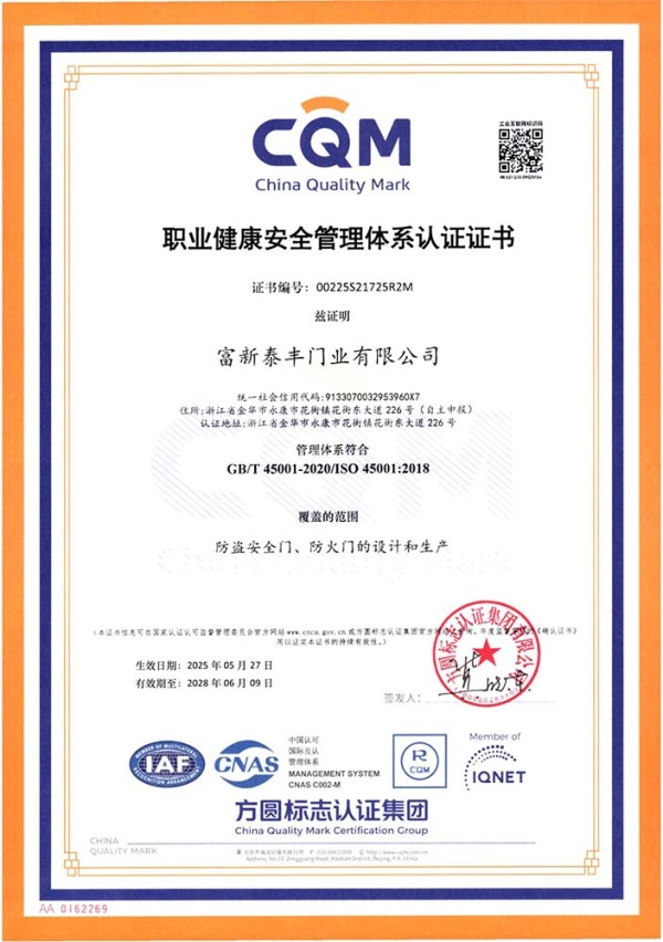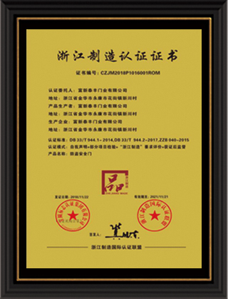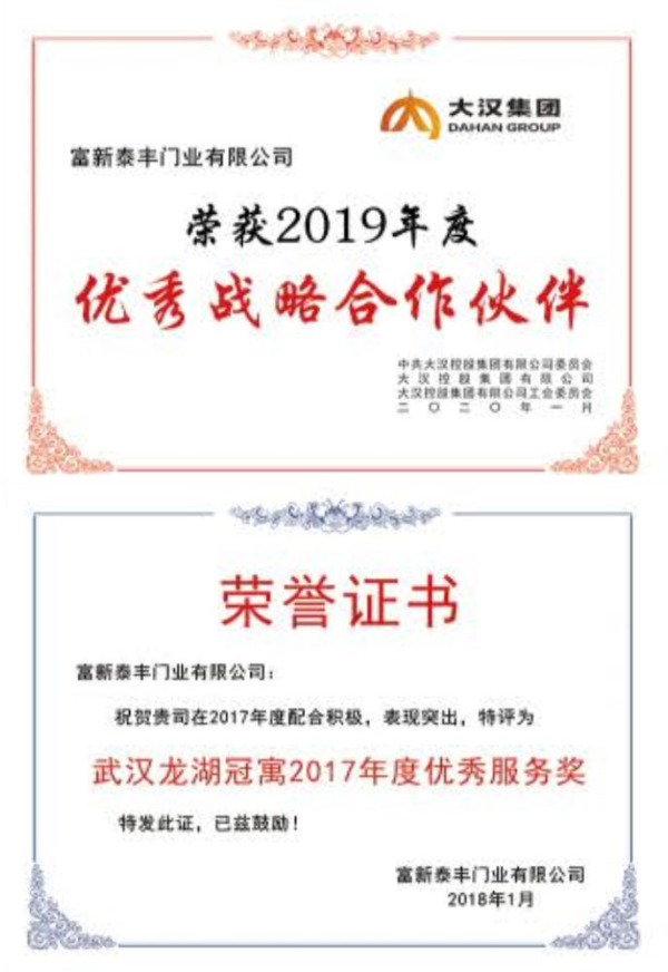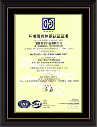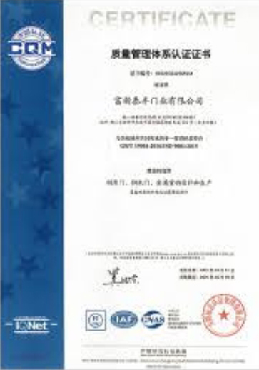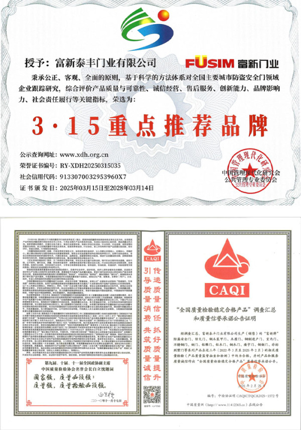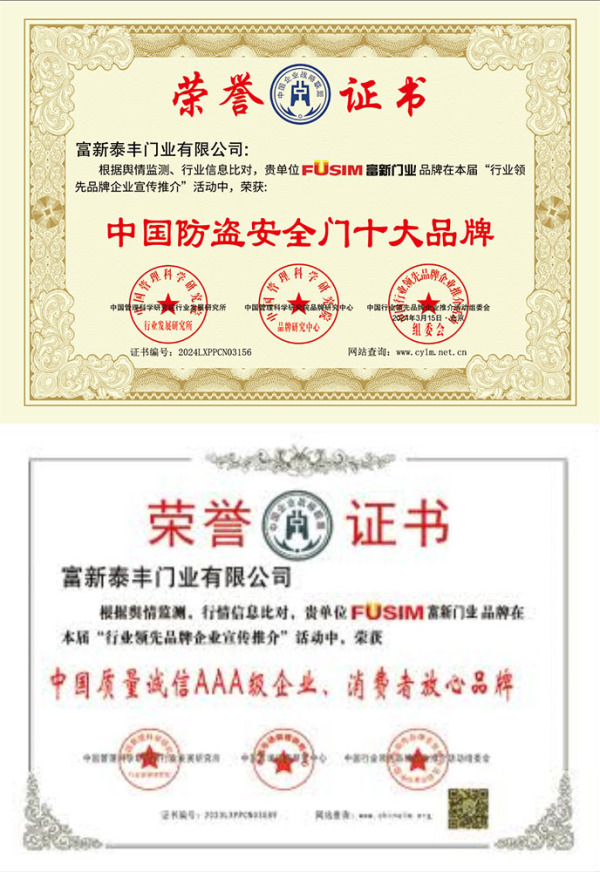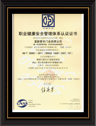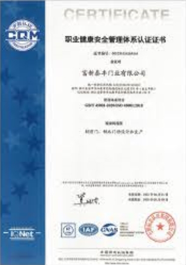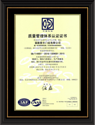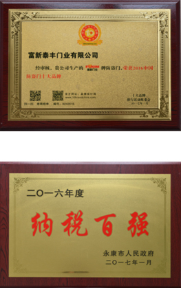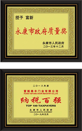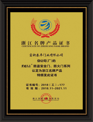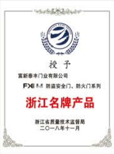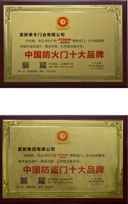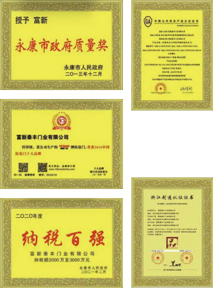 公司通過了1SO9001質量管理體系認證、ISO14000環境管理體系認證、1SO18000職業健康安全管理體系認證、中國環境標志認證、計量檢測體系認定、企業標準化良好行為AA級認定、納入產品質量電子監管管理等;“富新牌”商標曾獲得“浙江省著名商標”、“浙江名牌”,產品通過中國安全技術防范中心“GA"認證,“富新牌”防火門產品通過公安部消防產品合格評定中心3C認證,“富新牌”安全門、防火門、鋼木門均被評為中國十大品牌,在2018年底通過“浙江制造”品質認證;木質門被評為全國市場、工程木門企業30強,是中國門窗行業的主要生產企業之ー。