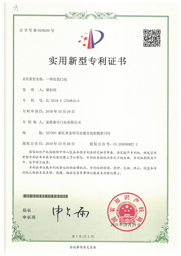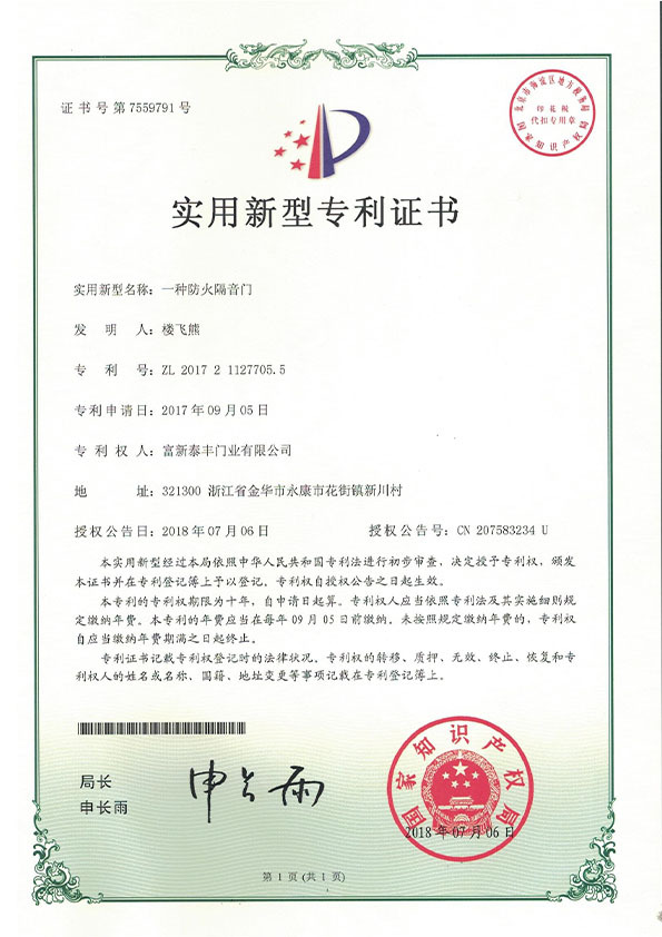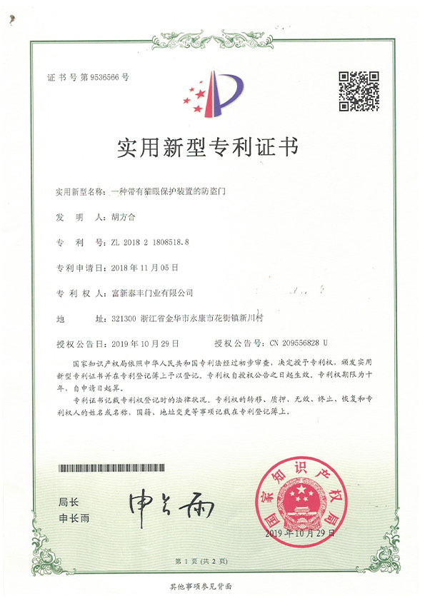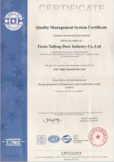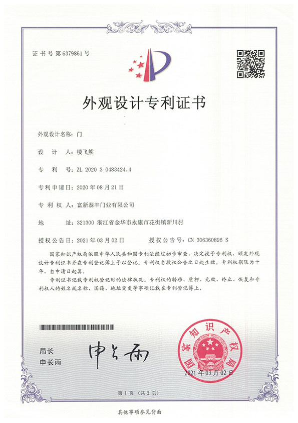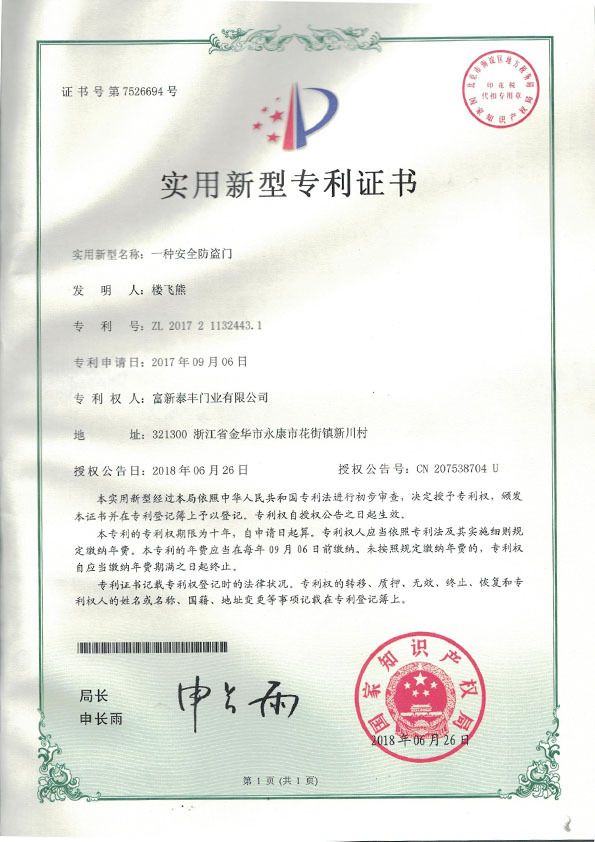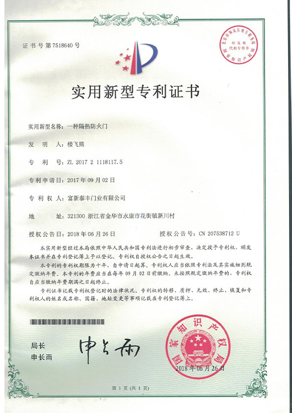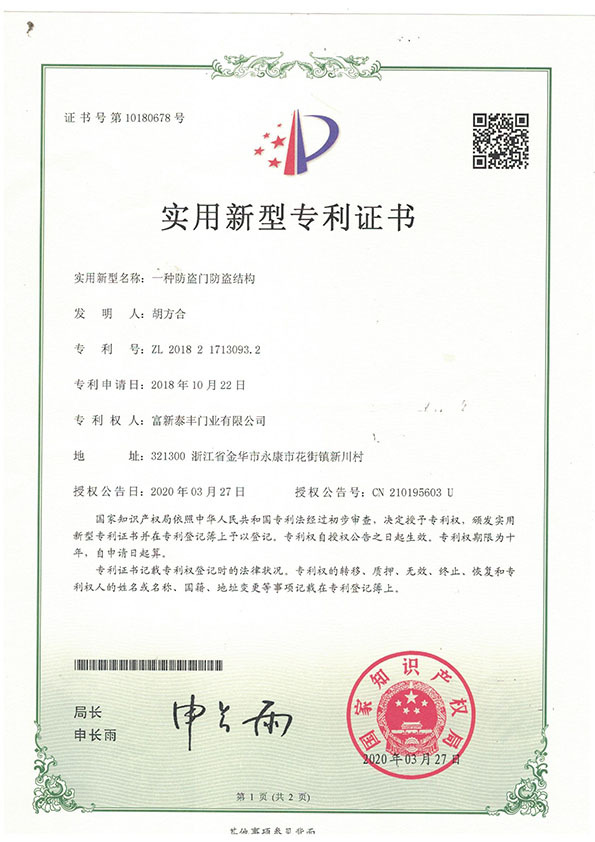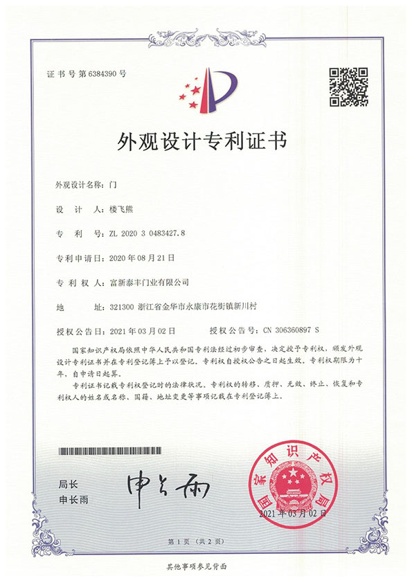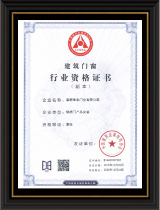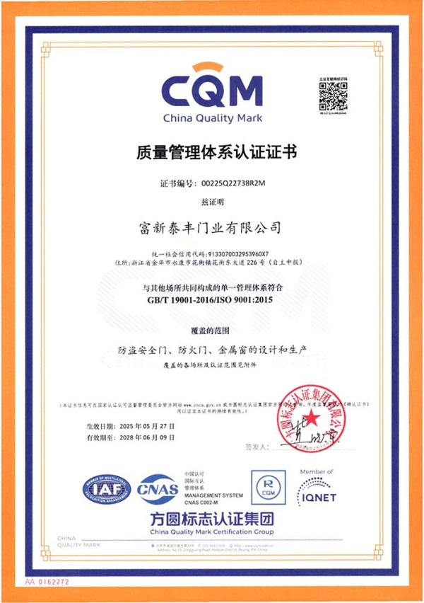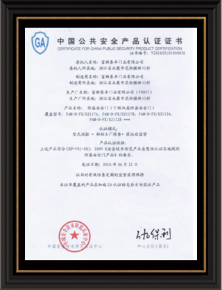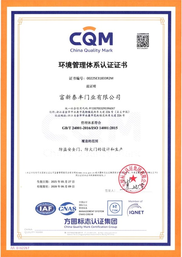 公司通過了1SO9001質量管理體系認證、ISO14000環境管理體系認證、1SO18000職業健康安全管理體系認證、中國環境標志認證、計量檢測體系認定、企業標準化良好行為AA級認定、納入產品質量電子監管管理等;“富新牌”商標曾獲得“浙江省著名商標”、“浙江名牌”,產品通過中國安全技術防范中心“GA"認證,“富新牌”防火門產品通過公安部消防產品合格評定中心3C認證,“富新牌”安全門、防火門、鋼木門均被評為中國十大品牌,在2018年底通過“浙江制造”品質認證;木質門被評為全國市場、工程木門企業30強,是中國門窗行業的主要生產企業之ー。