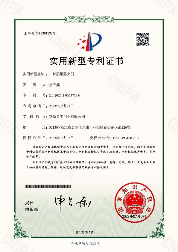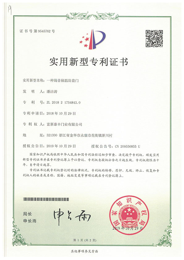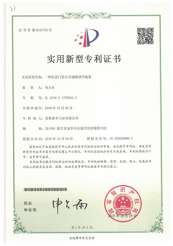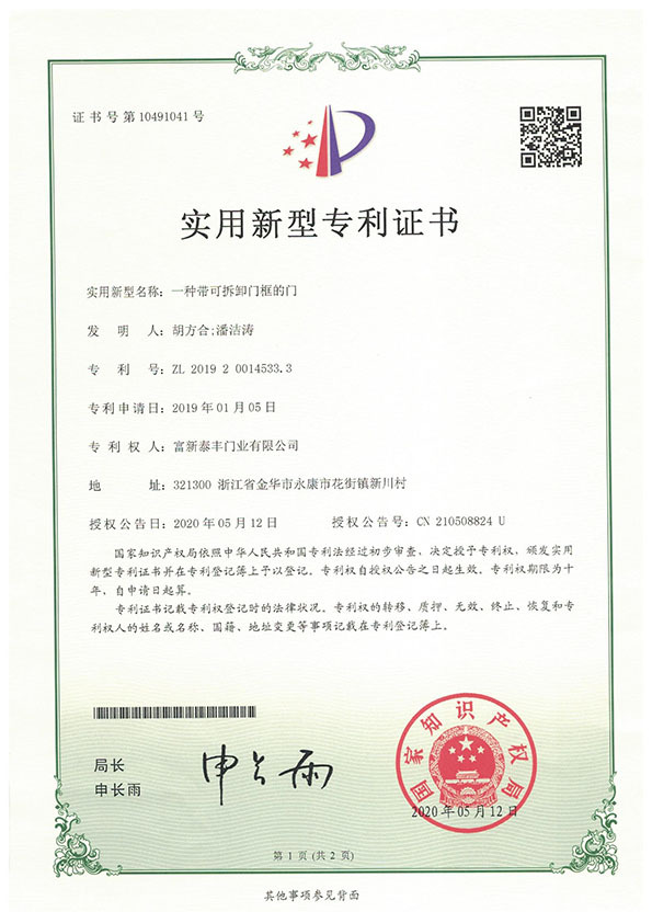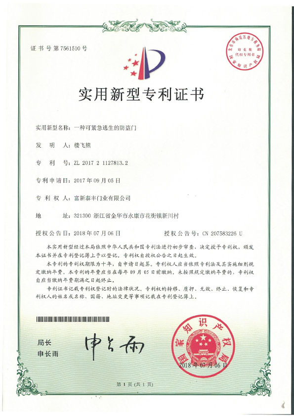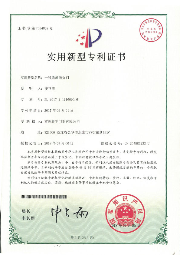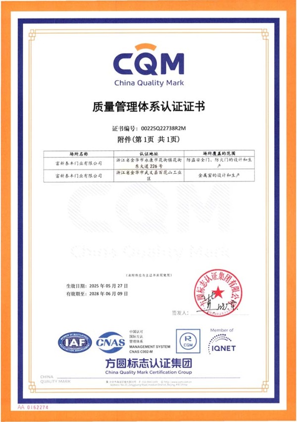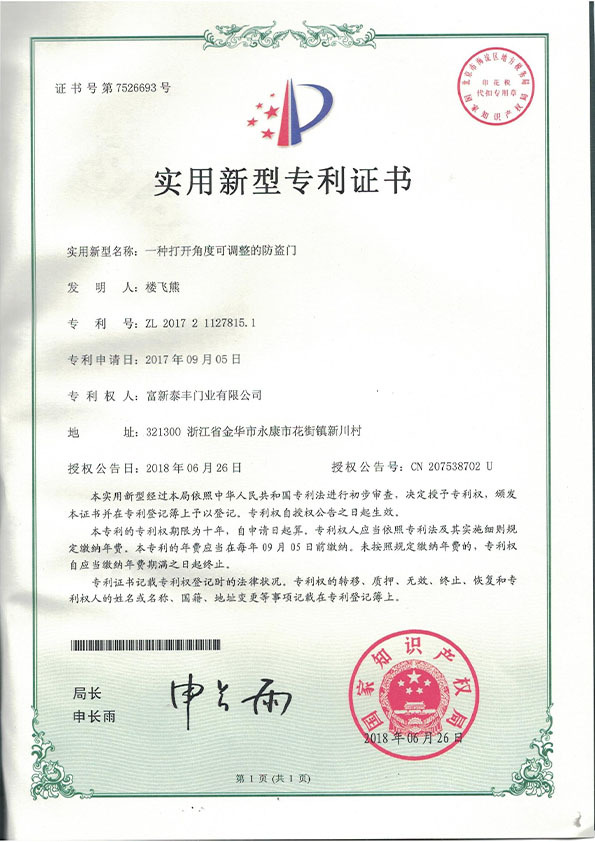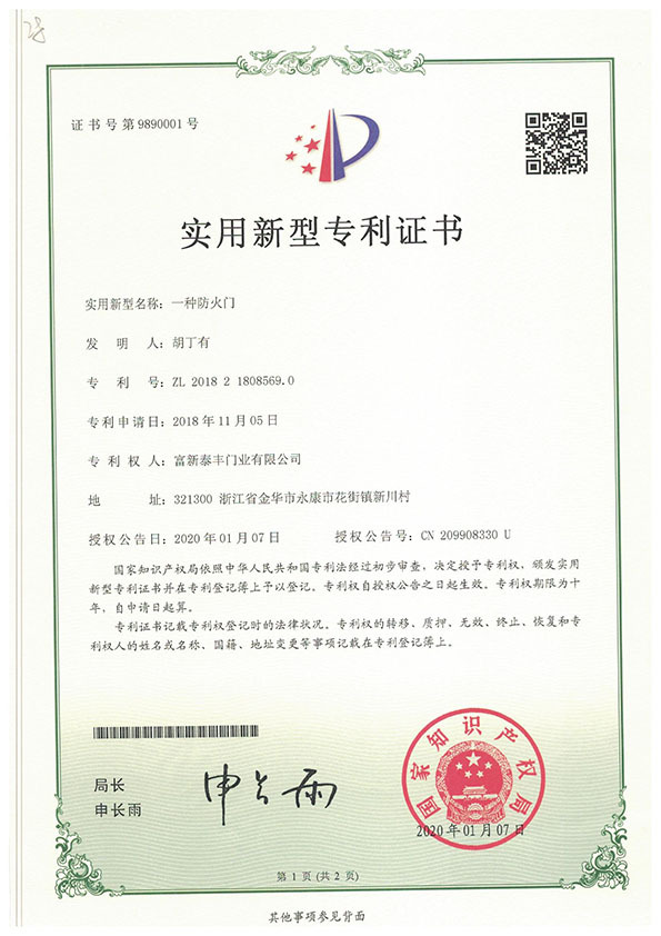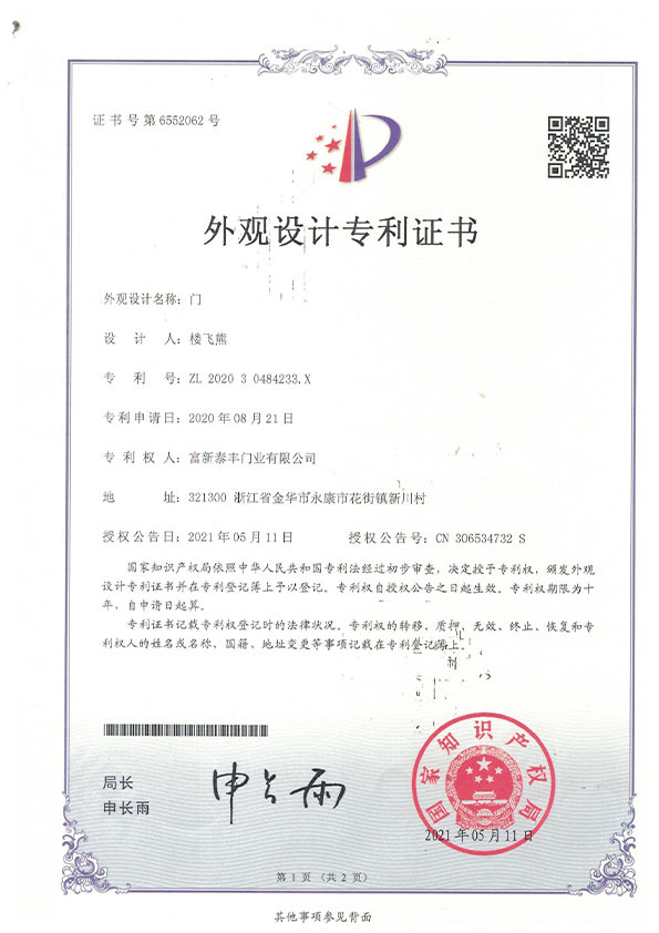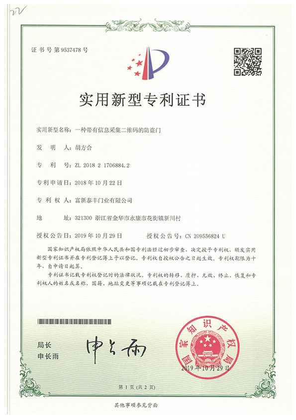 公司通過了1SO9001質量管理體系認證、ISO14000環境管理體系認證、1SO18000職業健康安全管理體系認證、中國環境標志認證、計量檢測體系認定、企業標準化良好行為AA級認定、納入產品質量電子監管管理等;“富新牌”商標曾獲得“浙江省著名商標”、“浙江名牌”,產品通過中國安全技術防范中心“GA"認證,“富新牌”防火門產品通過公安部消防產品合格評定中心3C認證,“富新牌”安全門、防火門、鋼木門均被評為中國十大品牌,在2018年底通過“浙江制造”品質認證;木質門被評為全國市場、工程木門企業30強,是中國門窗行業的主要生產企業之ー。