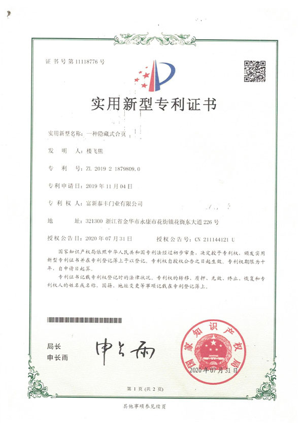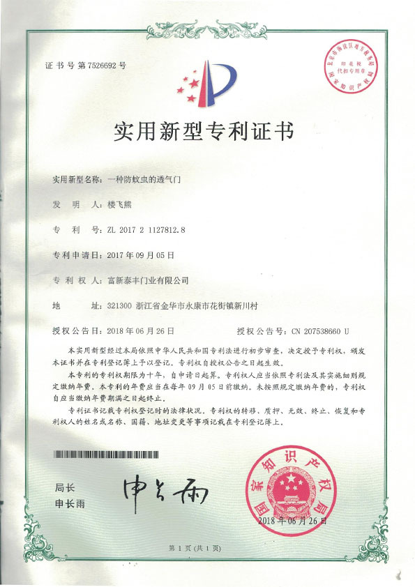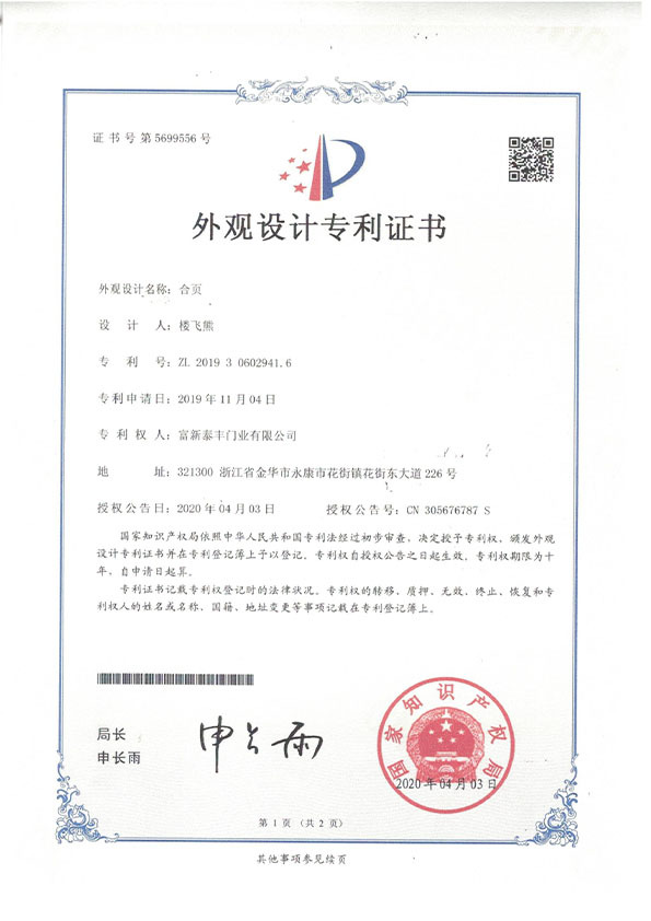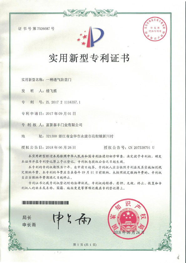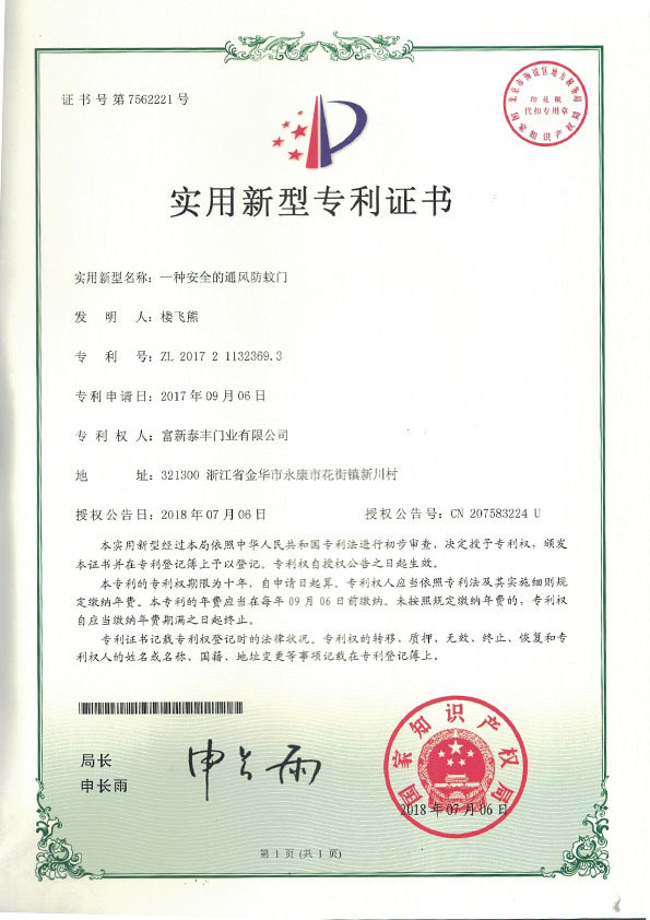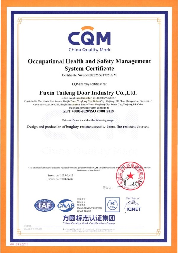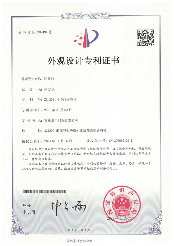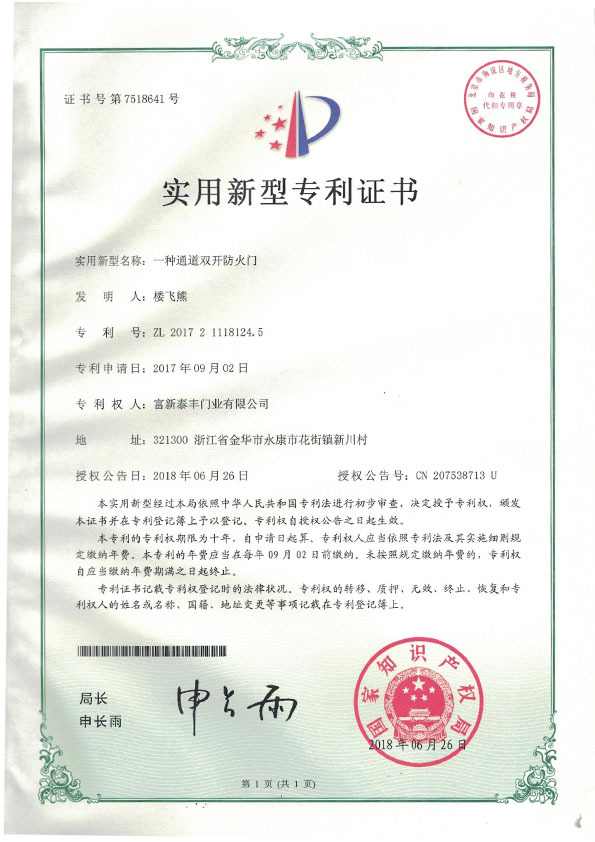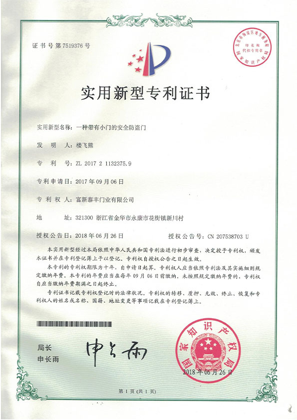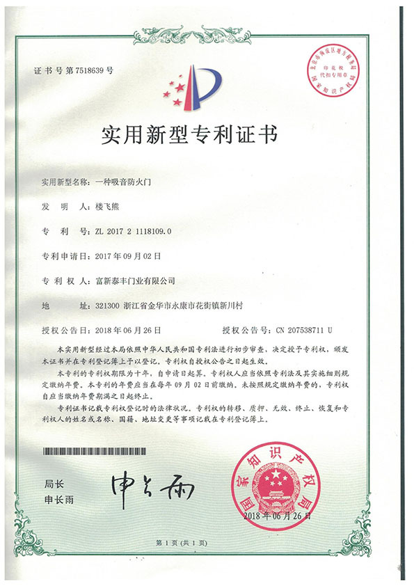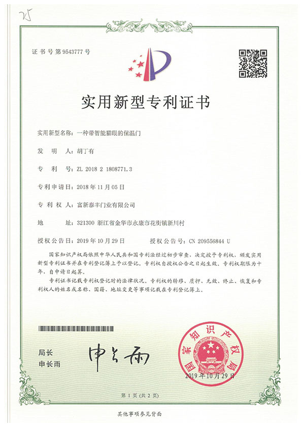 公司通過了1SO9001質量管理體系認證、ISO14000環境管理體系認證、1SO18000職業健康安全管理體系認證、中國環境標志認證、計量檢測體系認定、企業標準化良好行為AA級認定、納入產品質量電子監管管理等;“富新牌”商標曾獲得“浙江省著名商標”、“浙江名牌”,產品通過中國安全技術防范中心“GA"認證,“富新牌”防火門產品通過公安部消防產品合格評定中心3C認證,“富新牌”安全門、防火門、鋼木門均被評為中國十大品牌,在2018年底通過“浙江制造”品質認證;木質門被評為全國市場、工程木門企業30強,是中國門窗行業的主要生產企業之ー。